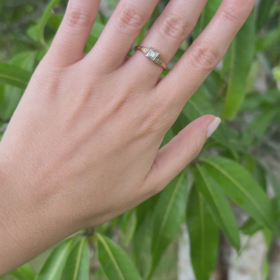 Step into the elegance of the late Art Deco to early Mid-Century era with this authentic 1930s ArtCarved diamond engagement ring, crafted in solid 14K two-tone gold. A white-gold square illusion head enhances the sparkle of the old European cut center diamond, framed by four tiny single-cut diamonds along milgrained shoulders. The hand-pierced open gallery and crisp geometric lines highlight the timeless artistry of this period.
