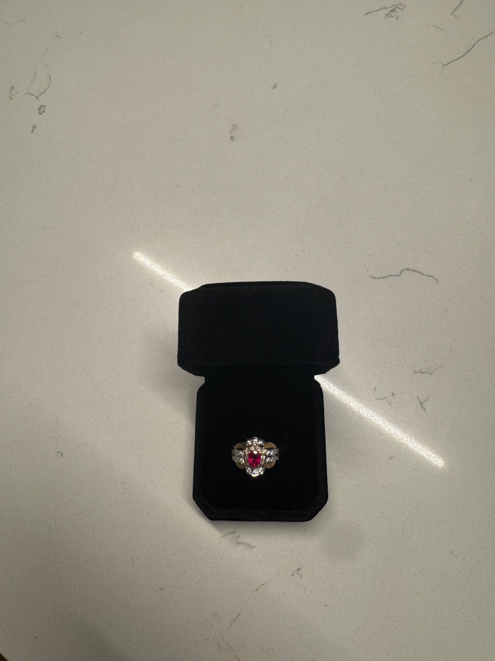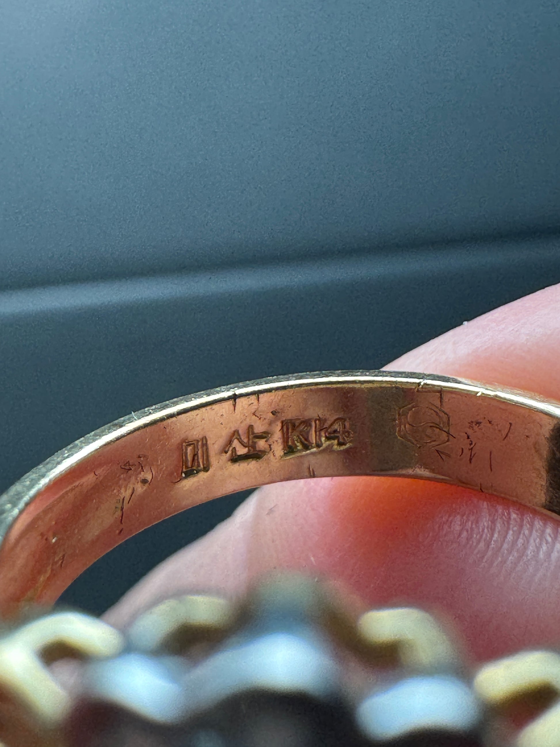This vintage cocktail ring is a stunning piece of fine jewelry that will make any occasion special. It has a Korean symbol next to the makers mark meaning "Mishan" which could either be the name of a girl or a Chinese city. "Mishan" could mean something like "beautiful mountain". With its oval-shaped ruby stone and 14K yellow and white gold, this ring is both elegant and timeless. The red color of the main stone is complemented by the white diamond accents, creating a beautiful contrast against any outfit. This ring is perfect for brides, cocktail parties, or any special occasion. It is signed making it a unique and one-of-a-kind piece. The ring is a size 6 3/4 and has a total of 32 diamonds, and 1 ruby gemstone centered. Add this gorgeous piece to your collection today and make a statement wherever you go.